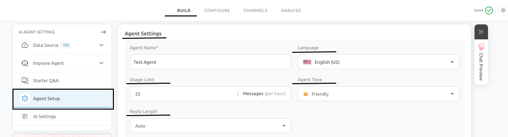 These settings help establish expectations before a user even asks the first question. If the language and tone do not match the audience, the AI Agent can feel off-brand or difficult to trust. Similarly, if the reply length is too long for a mobile-first audience, even correct answers may feel difficult to consume.