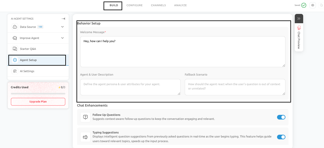 Behavior Setup directly impacts consistency. A strong welcome message tells users what they can ask. A clear AI Agent description helps keep the conversation relevant. A thoughtful fallback prevents the experience from ending in a confusing dead end when the user asks something unexpected.