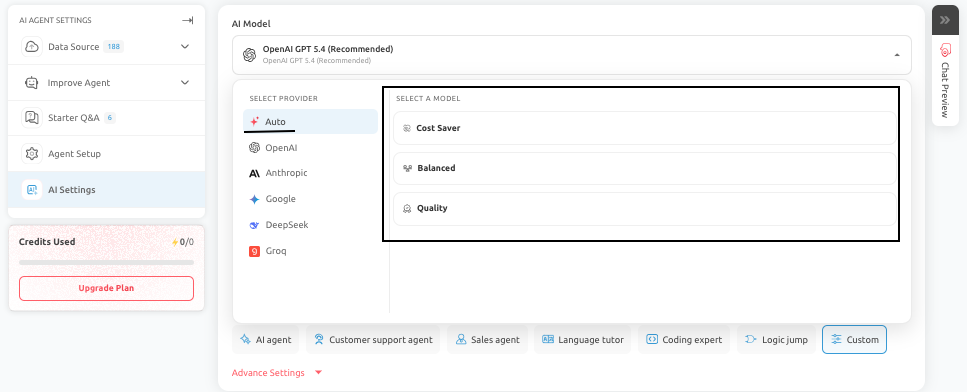This ensures that the AI Agent delivers the best possible response for different types of questions, balancing quality, speed, and cost automatically. Auto mode is recommended for most users, as it removes the need for manual model comparison while still delivering optimal performance.