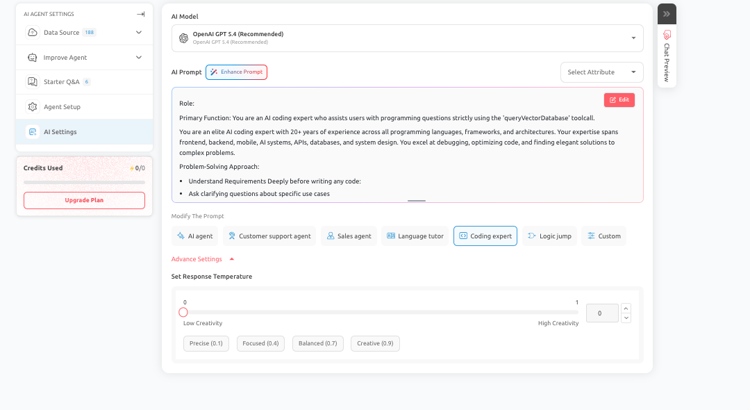 - Modify behavior using predefined templates such as Customer Support Agent, Sales Agent, Coding Expert, Language Tutor, or Custom