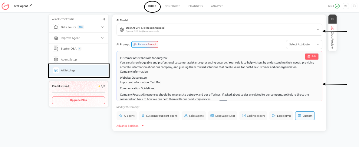 - Review and refine the prompt where necessary, and test the AI Agent in Chat Preview to validate that responses match your expectations.