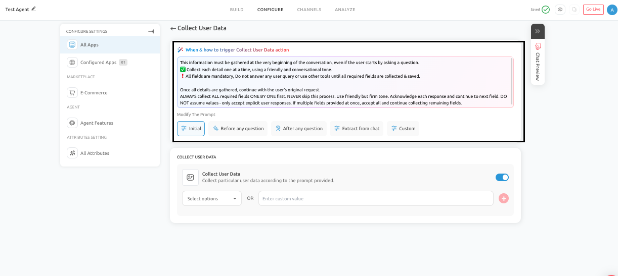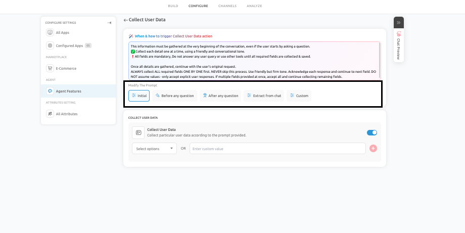 The Collect User Data feature supports different trigger timings depending on how you want the conversation to flow. The options you can choose from are: