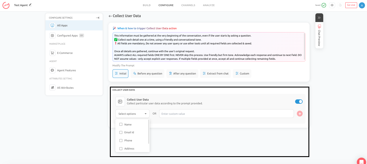 The Collect User Data feature allows your AI Agent to capture structured user information during a conversation. This feature is essential for workflows where the AI Agent must collect accurate details before taking the next step, such as sending leads to a sales team, routing a support issue, registering a user, or triggering a follow-up action.