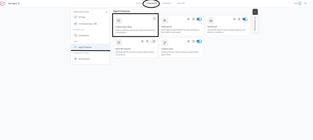 - Go to the Configure tab, and under Agent Features, click on Collect User Data.