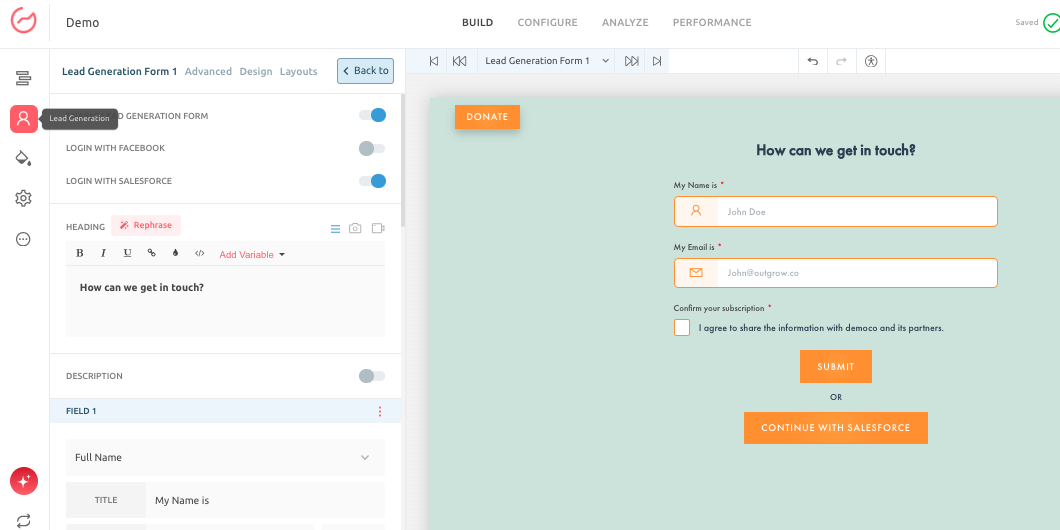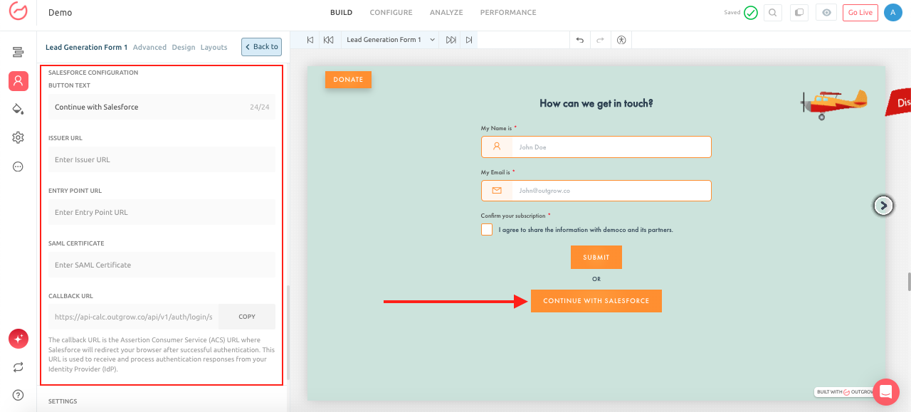 By following these steps, you can seamlessly integrate Salesforce SSO login with your Outgrow lead forms, providing a streamlined and efficient lead capture process. In case you still have any questions, feel free to reach out to us at [email protected], and I will be happy to assist you further.