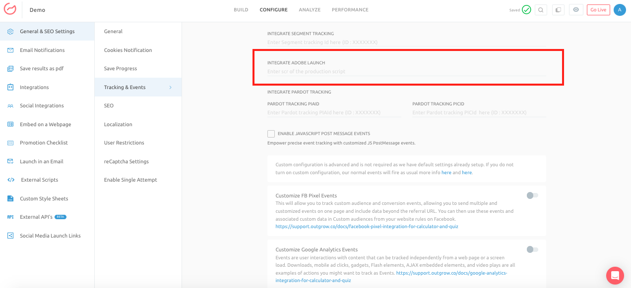 - Ensure that the event names and data elements in Outgrow match the configuration in Adobe Launch.