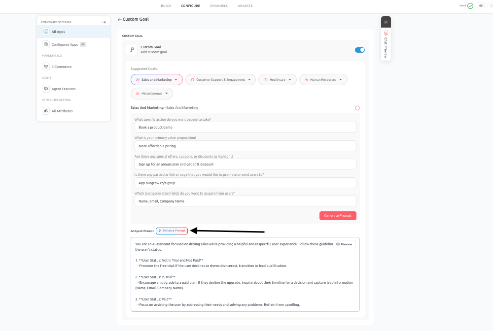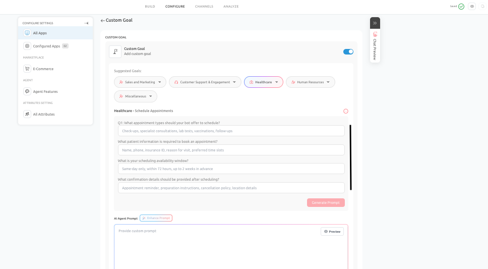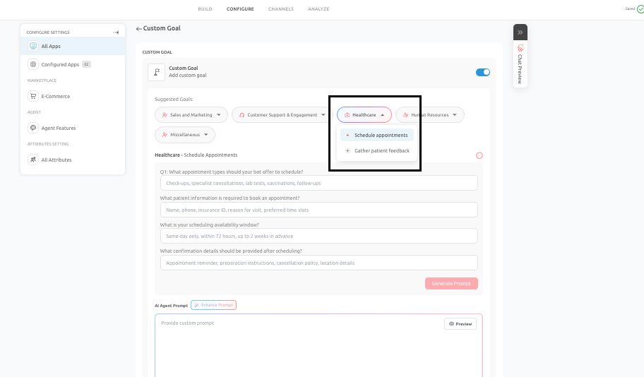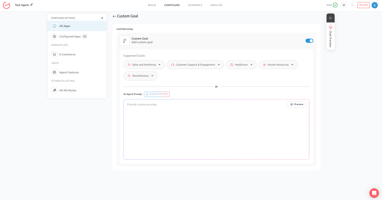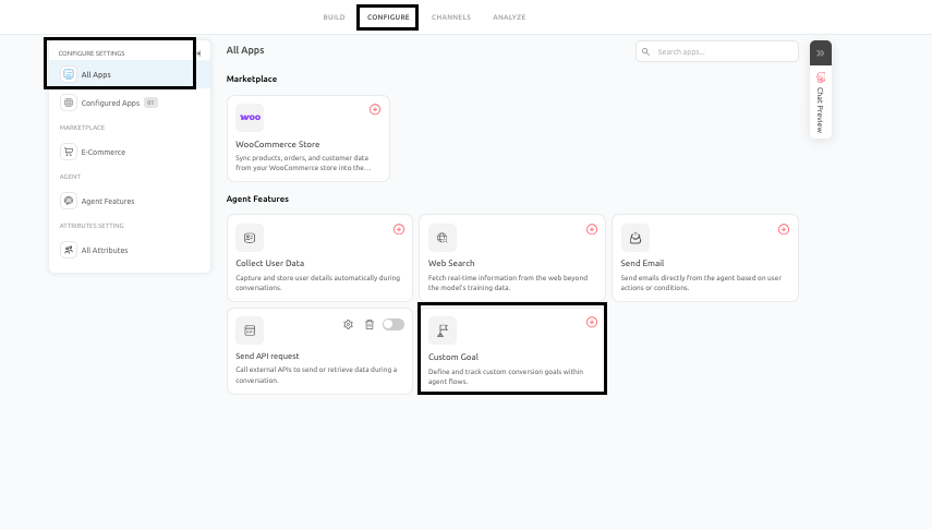 - Once inside the AI Agent builder, go to the Configure section. Under Configure Settings, go to All Apps and under Agent Features, click on Custom Goals.