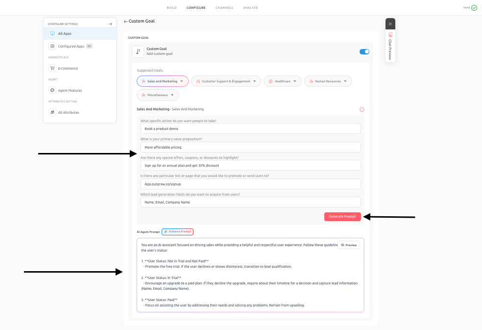 - Once the details are added, click on Generate Prompt to generate the customized goal-specific prompt for your agent.