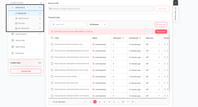 - Using Source Link: In the Source Link tab, add your links, fetch pages, select relevant ones, and start training while tracking their status.