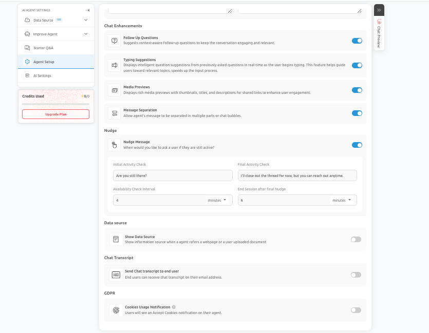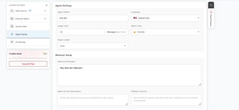 E. Step 5: Configure AI Agent Settings: In the Agent Setup section, you define how your AI Agent behaves and communicates. You can configure: