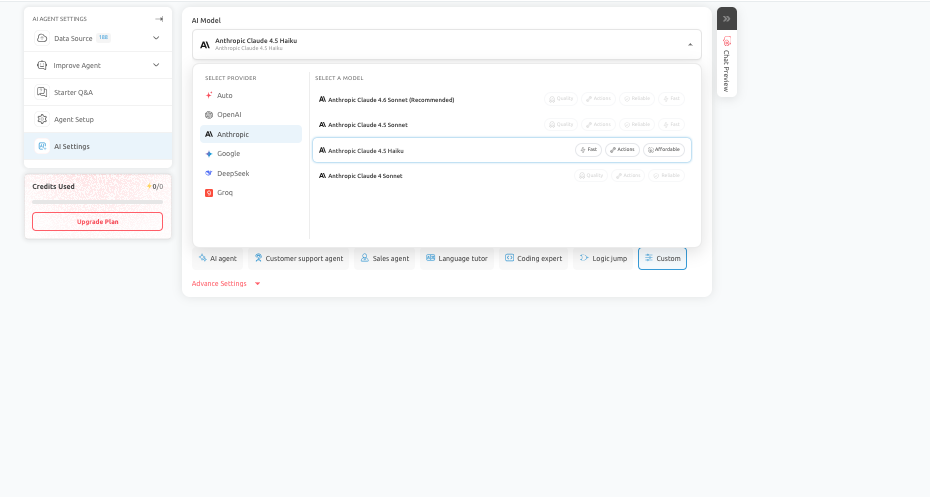 F. Step 6: Select AI Model and Configure Prompt: In this section, you configure the intelligence and behavior of your AI Agent. You can choose from multiple AI providers and models based on your needs. Different models offer varying levels of: